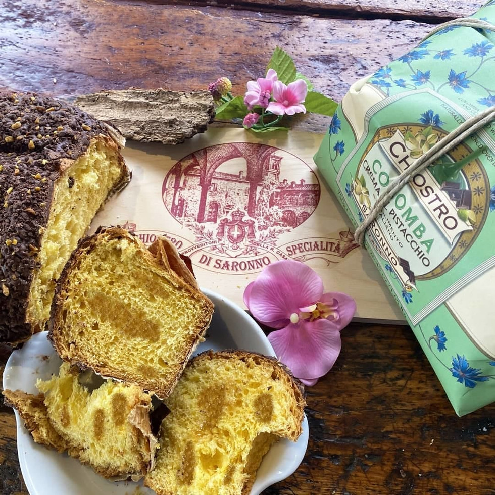 En luksuriøs panettone fylt med silkemyk pistasjkrem, overtrukket med mørk sjokolade og drysset med finhakkede pistasjnøtter. Denne klassiske italienske julekaken fra Chiostro di Saronno er laget etter tradisjonell oppskrift med naturlig surdeig, egg, smør og mel – hevet over flere dager for å oppnå den perfekte luftige strukturen og rike smaken.