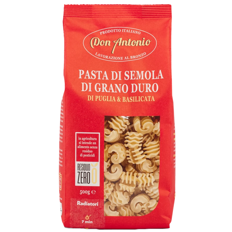 Radiatori er en sjarmerende pastatype formet som små radiatorer – designet for å fange opp saus i hver lille rille. Don Antonio lager denne pastaen av 100 % durumhvete, trukket gjennom bronseformer og tørket langsomt i opptil 42 timer ved lav temperatur for å bevare smak og tekstur.