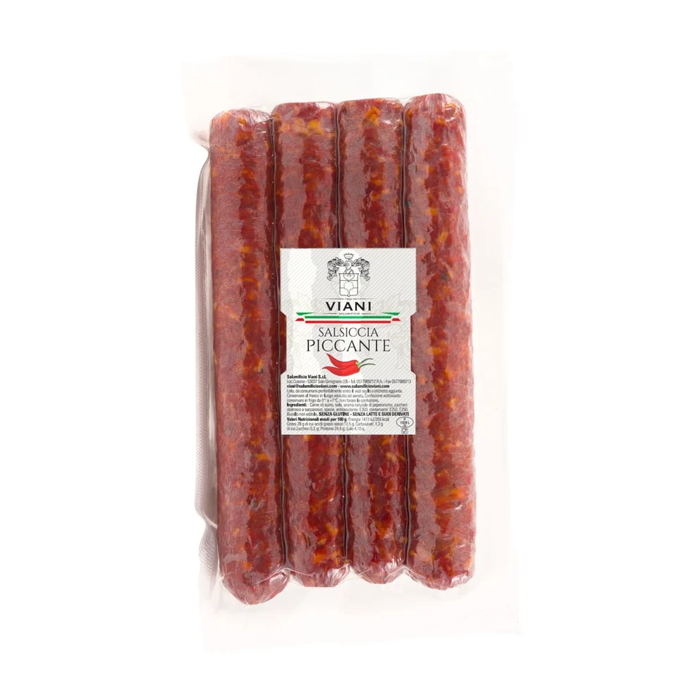 En ubestridt klassiker til pizza – og like anvendelig som antipasti, til steking eller som snacking. Salsiccia Piccante er en fersk, krydret salami med skarp hete og rund paprika-sødme. Dette er en av de mest brukte salamitypene i Italia, nettopp fordi den fungerer overalt: som topping på pizza, i panini, stekt som små salamichips i salater eller som ekstra “krydder” i en frittata med poteter og løk. En skikkelig smaksløfter – uten tull.